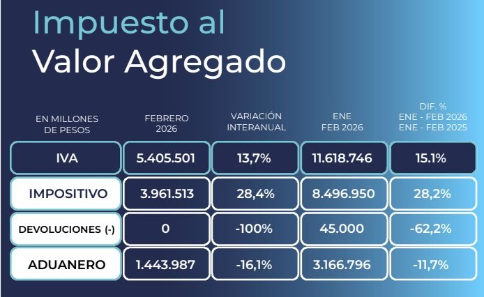 El IVA Impositivo creció 28,4%, impulsado por menores devoluciones respecto del año pasado, aunque el aumento de planes de pago atenuó el resultado. En cambio, el IVA Aduanero cayó 16,1%, afectado por la desaceleración de importaciones, dos días hábiles menos y el cambio en el régimen de certificados de exclusión que había elevado la base comparativa en febrero de 2025.