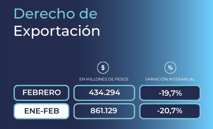 El punto más sensible del informe aparece en Derechos de Exportación. En febrero ingresaron $434.294 millones, con una caída interanual de 19,7%. La reducción de alícuotas explica el núcleo del retroceso.