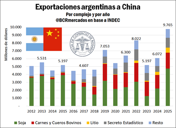 En dólares, entre los complejos soja, carne y cueros bovinos, y litio se explica el 85% de las exportaciones argentinas a este destino en 2025. Además de los complejos de oleaginosas, cereales, carne y minerales, el pesquero, el avícola, los lácteos, el complejo frutihortícola, el tabacalero y el forestal, entre otros, también encuentran en China un mercado estratégico de colocación de la oferta exportable.
