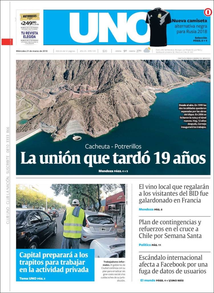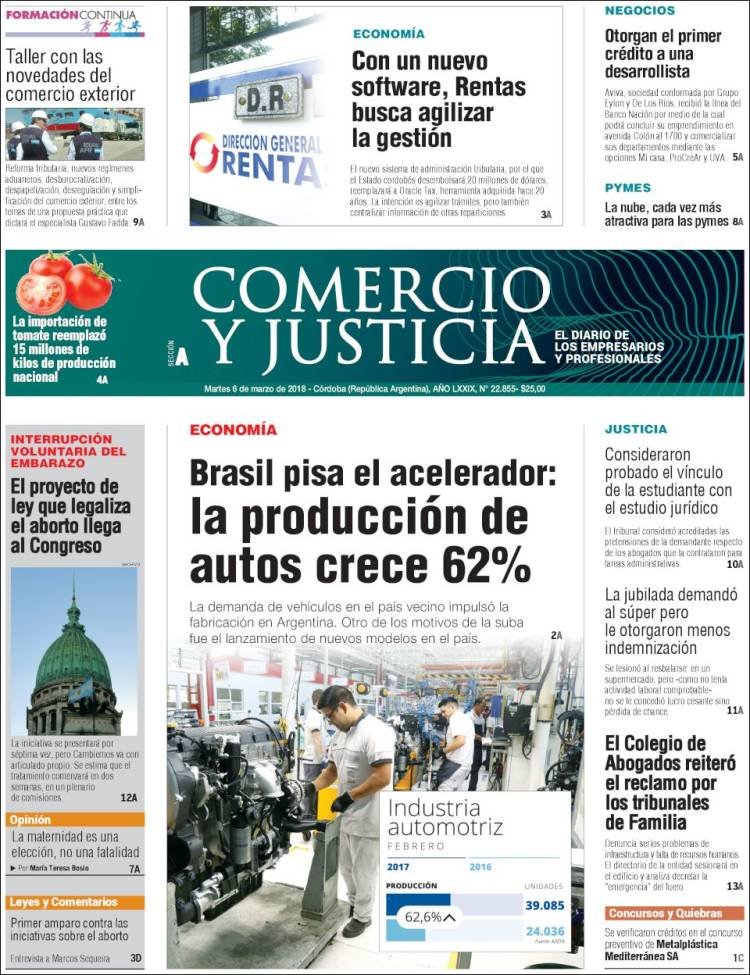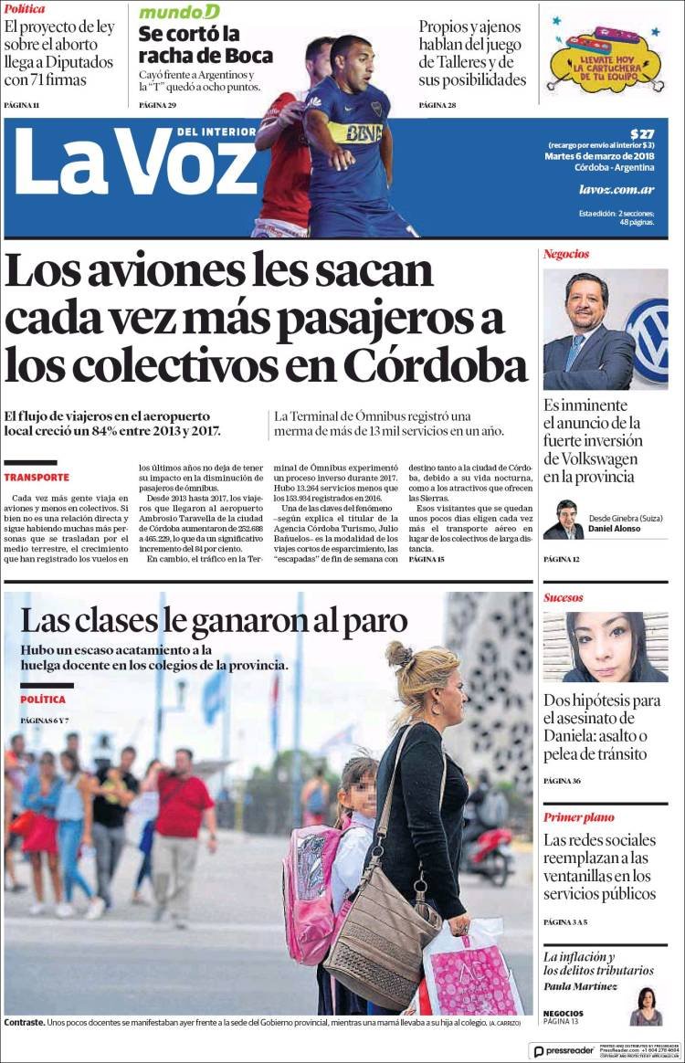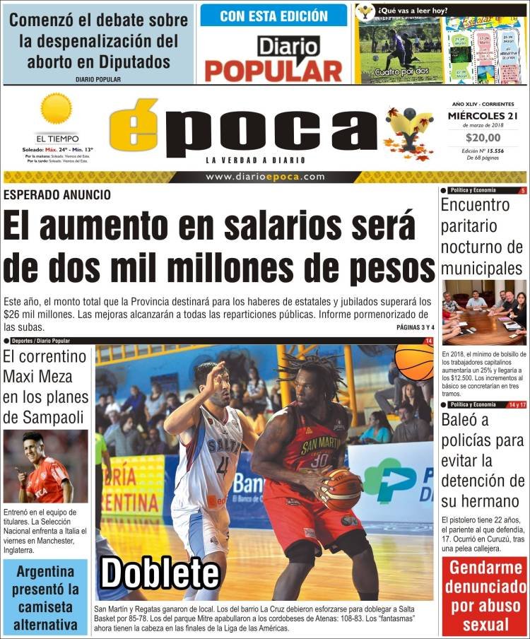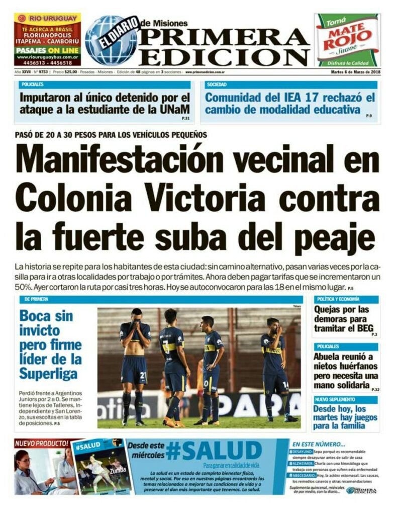 A continuación, reproducimos las tapas de los principales diarios del país. En lo local sigue el conflicto por el peaje de Colonia Victoria, mientras en lo nacional el debate por el aborto ocupó gran espacio, junto a los datos del desempleo, la venta de Lebacs,
