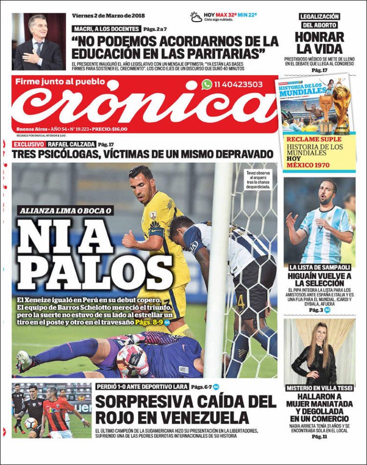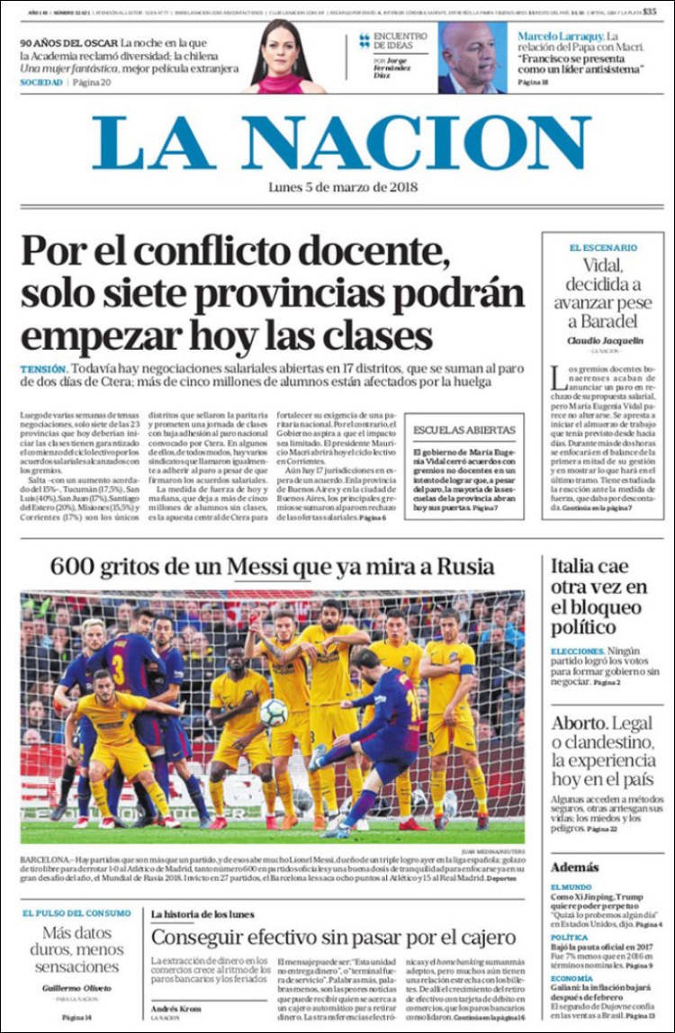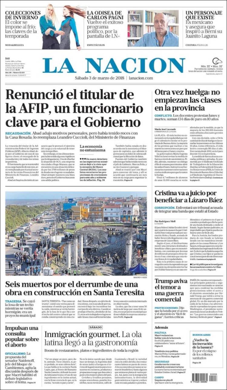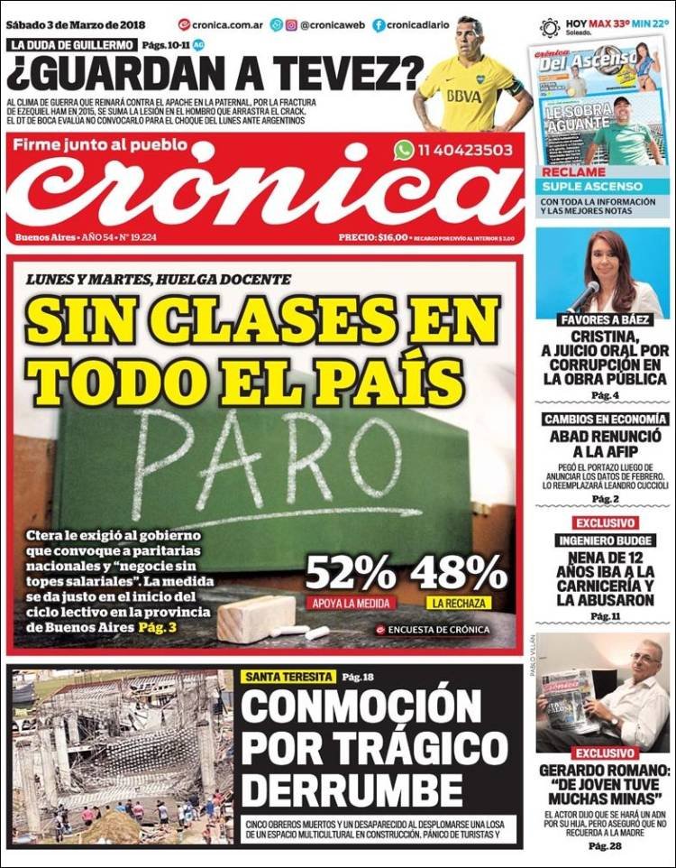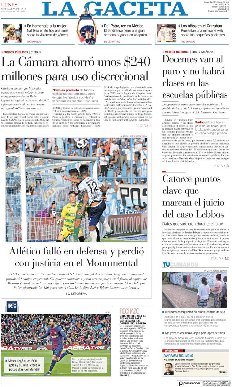 A continuación, reproducimos las tapas de los principales diarios de del país. Los temas predominantes son la apertura de sesiones a cargo de Mauricio Macri, el crecimiento de la Economía, la deuda, el conflicto con Bolivia y la violencia de género en Misiones.