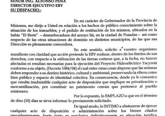 La misiva, fechada el 2 de octubre y difundida públicamente por el propio mandatario provincial, exige a la EBY que, en el plazo de diez días, informe qué acciones pretende llevar adelante respecto a los terrenos en cuestión, cuya restitución reclaman distintas organizaciones y clubes náuticos.