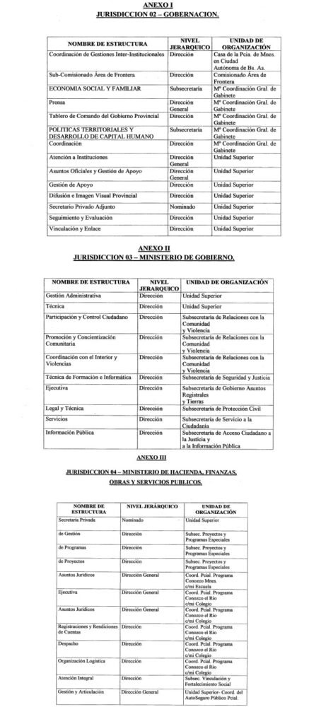 En términos operativos, el Artículo 2° determina que las Unidades de Conducción dependientes de las áreas eliminadas pasarán a depender de la Unidad Superior de la jurisdicción correspondiente. Esto implica una concentración de la cadena de mando, con menor estratificación jerárquica y mayor centralización funcional en cada ministerio o secretaría.