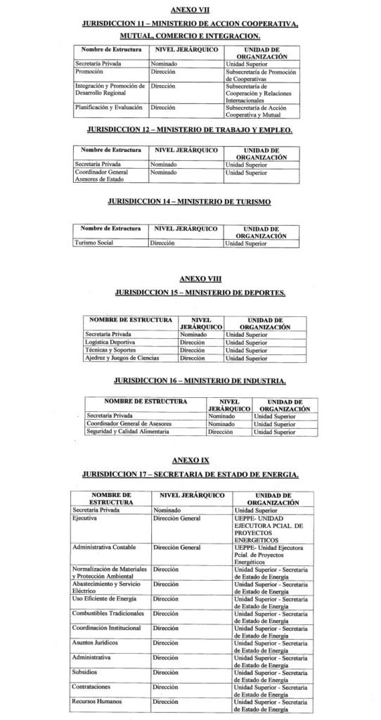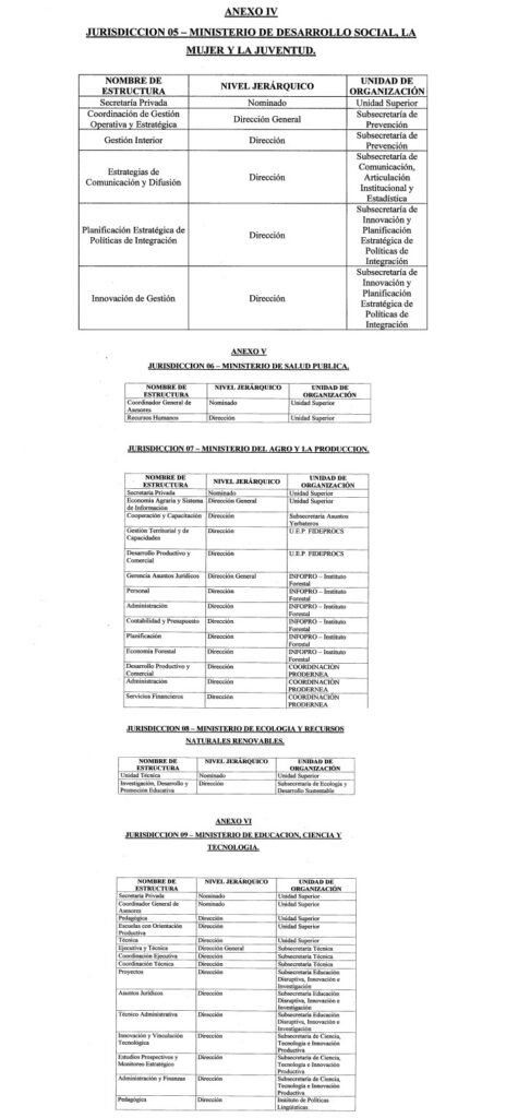 En los considerandos, el decreto sostiene que, tras un “análisis exhaustivo de la estructura orgánica vigente”, se detectó que “ciertos niveles jerárquicos, varios de ellos vigentes desde hace tiempo, presentan un grado de funcionamiento que torna aconsejable su eliminación”.
