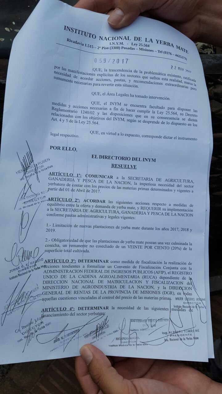 El pasado 15 de marzo los productores cumplieron su promesa. Luego de un año de reclamos, con 39 actas de reuniones en diferentes ámbitos, en la provincia y a nivel nacional, incluso luego de llevar un #yerbatazo a Buenos Aires, no fueron escuchados. Por ello decidieron protestar frente a la sede del INYM en Posadas, llegado a ingresar a la fuerza al Instituto.