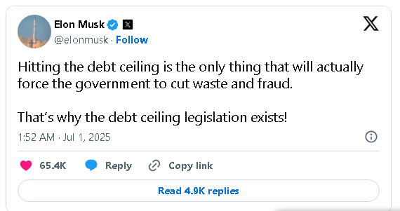 La autocrítica surgió tras un cruce en X: Musk afirmó a la 1.52 (hora del Este) que “llegar al techo de la deuda es la única manera de obligar al gobierno a recortar despilfarro y fraude”, pero un usuario le reprochó “actuar como un tonto” con la herramienta que simboliza el ajuste libertario.