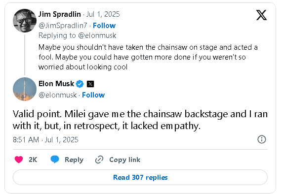El empresario respondió: “Valid point. Milei me dio la motosierra entre bambalinas y salí con ella, pero, en retrospectiva, le faltó empatía”.