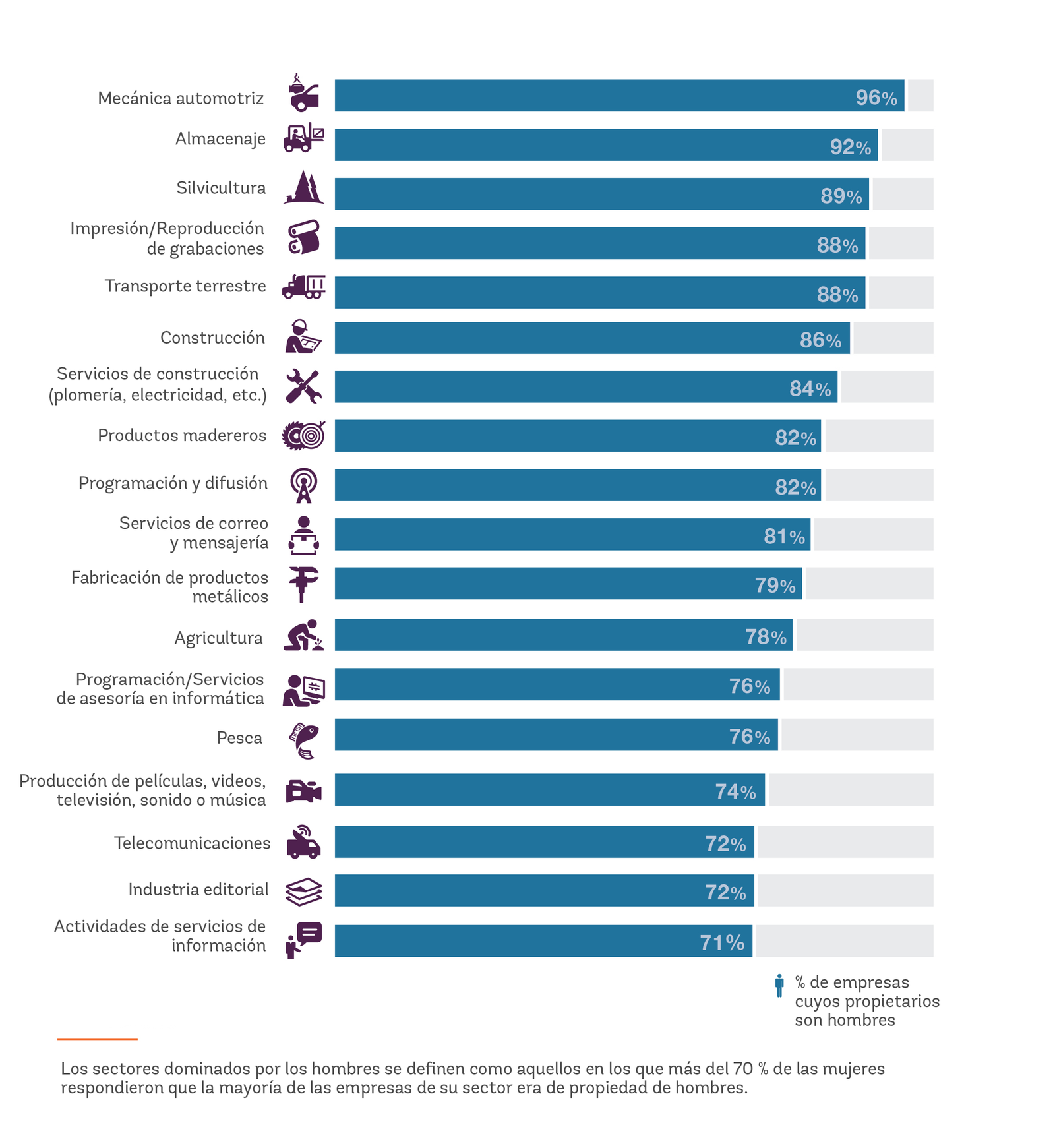 Las redes de apoyo masculino parecen ser fundamentales para las empresas de propiedad de mujeres; los modelos masculinos para imitar y la propiedad compartida con los cónyuges son factores que influyen en la decisión de las mujeres de incursionar en esos sectores. El apoyo de los cónyuges ayudó a las mujeres a emprender en estos sectores dominados por los hombres si dicho apoyo era multidimensional (por ejemplo, respaldo financiero, apoyo moral y ayuda en el trámite de registro de las empresas). Al parecer, las mujeres que emprenden en sectores dominados por los hombres trabajan más horas por semana y tienen una menor proporción de empleadas en comparación con las empresas de propiedad de mujeres en sectores con mayor concentración de mujeres.