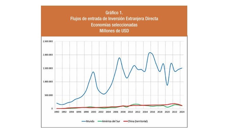 En este capítulo de las inversiones extranjeras directas (IED), los países de América Latina siguen, en promedio, la tendencia de caída de los flujos de entrada de inversiones entre 2024 y 2025. Sin embargo, en el corriente año se verifica un mayor número y valor de proyectos anunciados hacia el futuro en Argentina, Brasil y México. Es interesante notar que comparando la recepción de los flujos a lo largo del tiempo desde los años 90, China y los países de América del Sur han participado con niveles semejantes. Sin embargo, la naturaleza de las inversiones fue diferente, ya que en China esos flujos permitieron el desarrollo de cadenas de valor industriales y tecnológicas y en América del Sur se concentraron en la explotación de recursos naturales. Sin embargo, un aspecto distintivo hasta muy recientemente ha sido que, en oportunidad de cada crisis financiera internacional, las inversiones totales decrecían y China disminuía su participación mientras América del Sur la mantenía o la mejoraba (Gráfico y Cuadro 1).