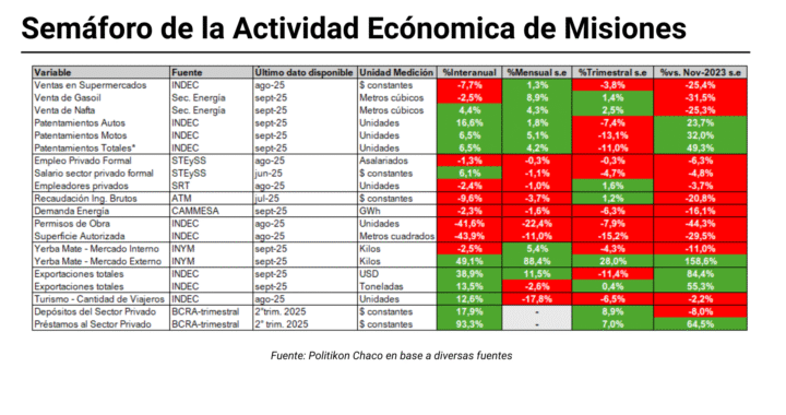 Hacia dentro del país, la situación es diversa, pero la tónica general todavía es negativa. Las provincias no sienten los efectos del presunto orden macro y, mucho menos, cuentan con “micros” que ordenen hacia arriba. Para medir este escenario retomamos el Semáforo de Actividad Económica de Misiones, herramienta que permite evaluar el estado de la economía provincial en función de indicadores clave de actividad. Así podremos corroborar si existe solidez en el argumento presidencial (spoiler: no).