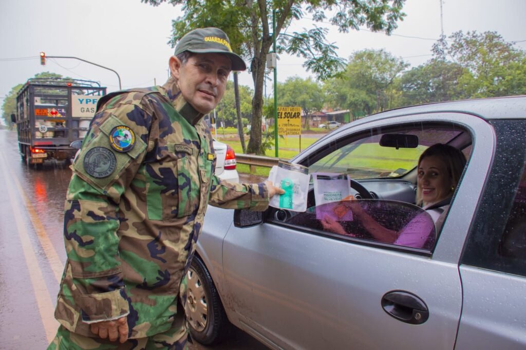 Por la tarde, el Ministerio de Ecología continuó con actividades de sensibilización en el marco de la campaña “No Me Quemés”, en la intersección de avenida Los Pioneros y Jauregui, en Comandante Andresito. Las acciones se desarrollaron de manera articulada con personal municipal, Bomberos Voluntarios y guardaparques de la Reserva de Uso Múltiple Cabure-í.
