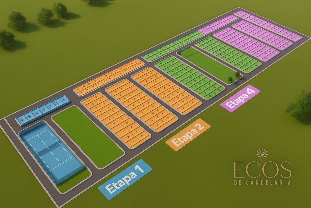 En sus 23 hectáreas cuidadosamente diseñadas, Ecos de Candelaria ofrece una experiencia de vida que conjuga tranquilidad, seguridad y bienestar, con un fuerte anclaje en la naturaleza. La propuesta incluye 406 lotes residenciales -de entre 320 y 360 m²- distribuidos en cuatro etapas, con una planificación que prioriza el confort y la armonía del conjunto.