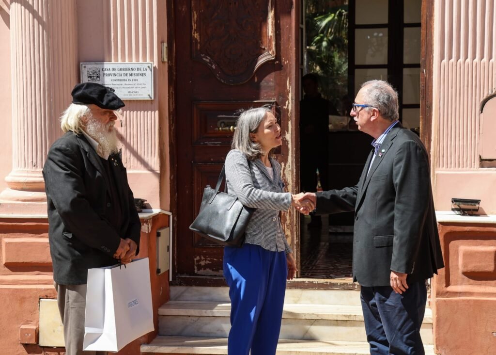 Luego del encuentro, el gobernador acompañó hasta la salida a la embajadora y al productor yerbatero Hugo Sand, y aprovechó para mostrar parte del patrimonio de la Casa de Gobierno, relatando su historia y destacando la importancia de conservar y transmitir la memoria institucional a las nuevas generaciones.