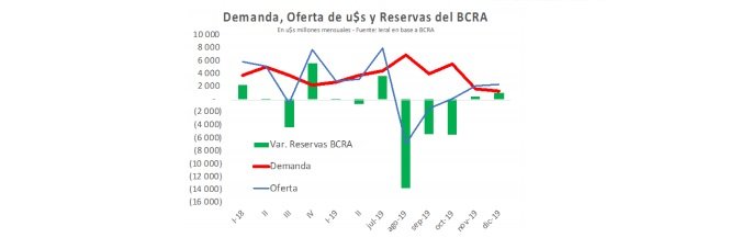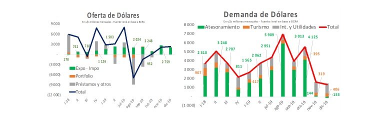 Por el lado de la demanda, el fuerte aumento del precio de la divisa, junto con los estrictos controles cambiarios terminaron reduciendo fuertemente el atesoramiento de dólares por parte de los particulares. El mismo pasó de un máximo de más de u$s 5.000 millones en el mes de agosto a niveles prácticamente nulos en los últimos dos meses del año. En el segundo componente que explica la caída de la demanda de divisas es el Turismo (neto) que también registró una significativa reducción a lo largo del 2019. Este rubro comenzó el año con un promedio de un poco más de u$s 900 millones mensuales y terminó el 2019 con un promedio inferior a los u$s 400 millones mensuales durante el segundo semestre.