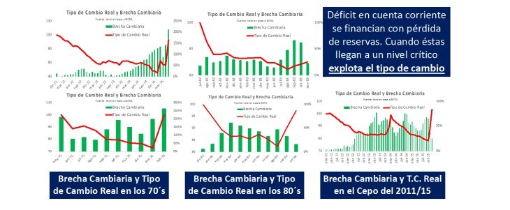 Estos déficits de cuenta corriente se financian con pérdidas de reservas. Cuando las mismas alcanzan niveles críticos, el tipo de cambio real “oficial” sufre un repentino ajuste, desequilibrando así a toda la economía. Esta es la historia que vivió nuestro país durante gran parte de los años 70´s, 80´s y entre 2011 y 2015.