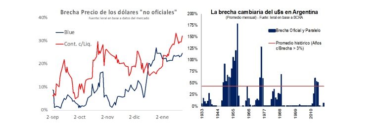 El virtual congelamiento del dólar oficial no se replicó en los precios “no oficiales” de la divisa que aumentaron la brecha respecto de la cotización “oficial”, ubicándola en niveles entre el 20% y 30% (aún bastante por debajo de la brecha histórica).