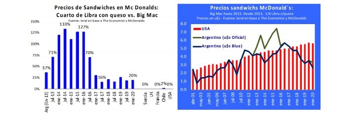 Este análisis del tipo de cambio en base a precios de bienes, ha sido realizado por más de 30 años con la revista británica The Economist a través de un artículo totalmente homogéneo en los diferentes países como es el precio del sandwich “Big Mac” de la cadena McDonalds. Sin embargo, en el caso de Argentina, primero por regulaciones de precios y luego probablemente por políticas comerciales, el precio de dicho sándwich en nuestro país se encuentra distorsionado respecto de otro sándwich (“Cuarto de Libra con Queso”) de la misma cadena. Debido a esta “distorsión” en el precio del “Big Mac”, en Argentina utilizamos para dicho análisis el precio del sándwich “Cuarto de Libra con Queso”.