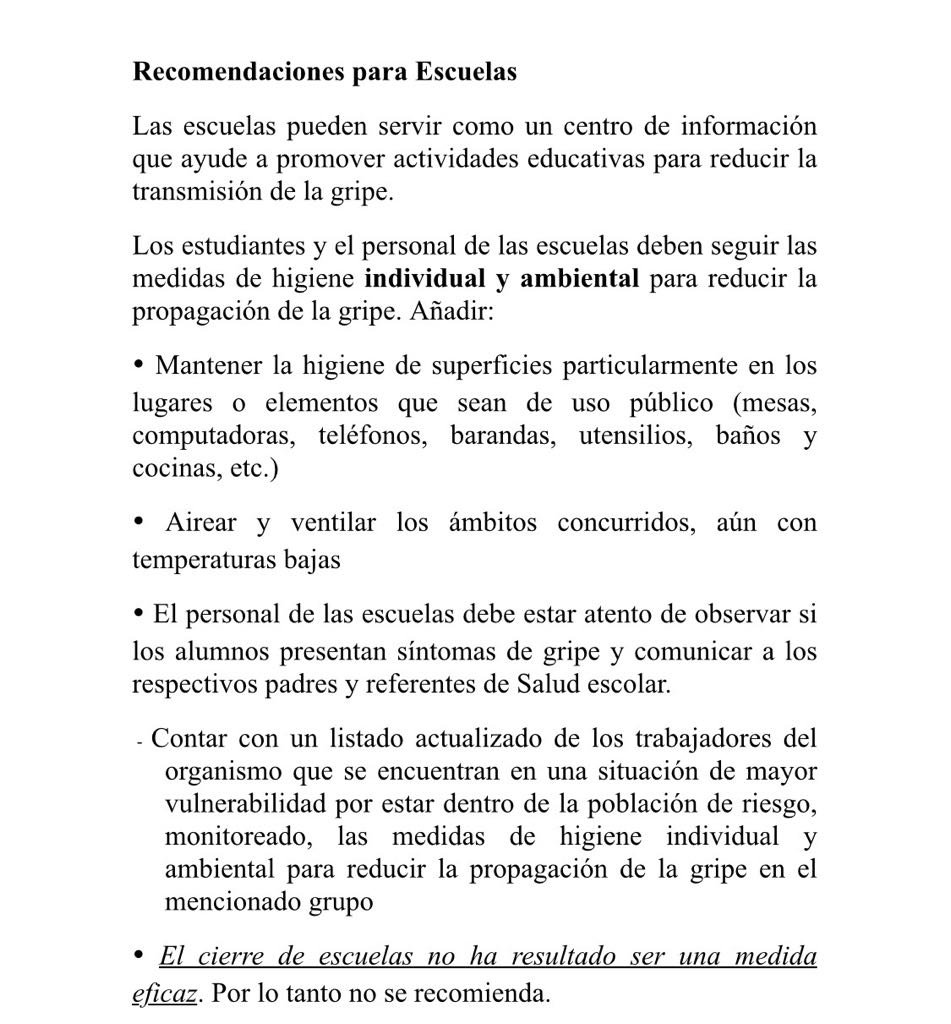 El Ministerio de Salud Pública recomendó que las escuelas tienen que servir como centro de información para promover actividades que reduzcan la transmisión de la gripe.