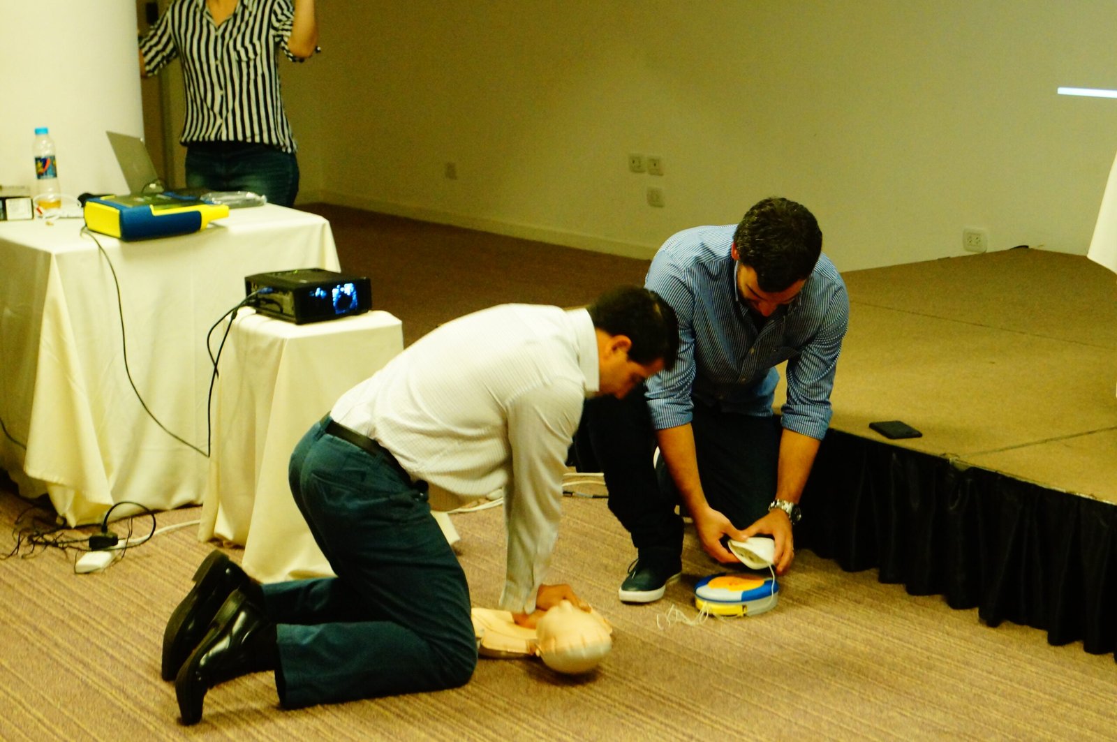 El cardiólogo indicó que un 15 por ciento de los casos ocurre en el lugar de trabajo y solo el 0,0005 por ciento de las empresas están correctamente preparadas para esta situación. Explicó que no es solo tener un desfibrilador para estar cardioprotegido, sino que hay que saber donde está ubicado, que todos los trabajadores sepan hacer RCP y conocer como usar el desfibrilador.