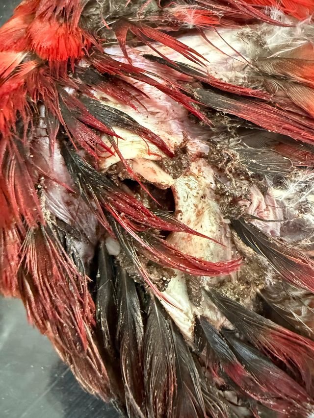 La ausencia de otras heridas que sugieran el ataque por parte de otro animal, el tipo y la ubicación de la lesión y, además, el reporte de pobladores de la zona de la presencia de un grupo de personas con gomeras y aire comprimido en el día y horario en que el guacamayo fue encontrado herido sugiere que el ave fue disparada con una de estas armas cuando se encontraba en vuelo.