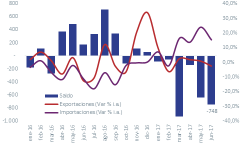 El déficit comercial volvió a aumentar con fuerza en junio, alcanzando USD 748 millones, en comparación con un superávit de USD 174 millones en junio de 2016. De esta manera, el primer semestre acumula un déficit de USD 2.613 millones, el mayor para dicho periodo desde 1994, en pleno proceso de liberalización comercial y con una economía creciendo al 6%.