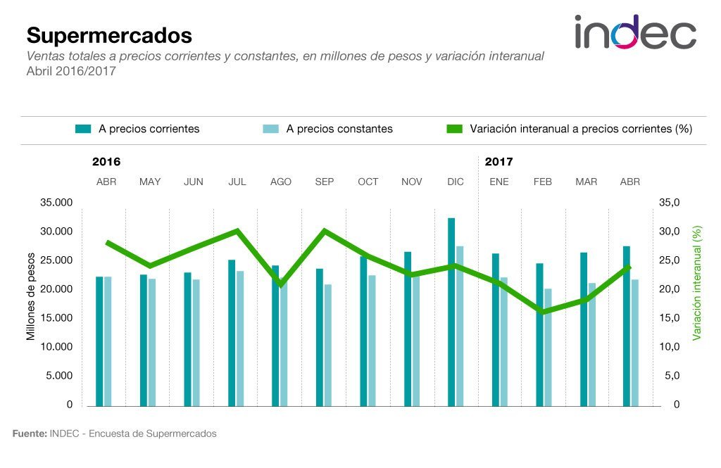 La inflación mensual del IPC en junio fue de 1,2%, mientras que la núcleo se ubicó en 1,3%. La inflación interanual fue de 21,7%, combinando el IPC-GBA hasta diciembre de 2016 inclusive con el IPC desde enero de 2017.