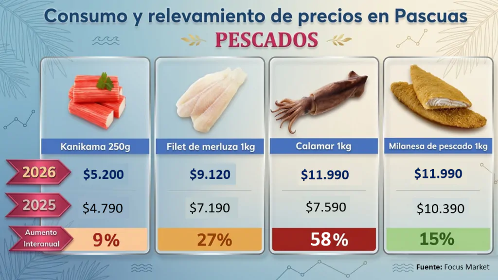El informe confirma que el mayor incremento se dio en la rosca artesanal de 500 gramos, que pasó de $8.000 a $13.000 (63%), mientras que el kilo de calamar subió 58% y lideró los aumentos dentro de pescados. En paralelo, los huevos de Pascua también mostraron alzas significativas, con variaciones de hasta 49% según el producto.