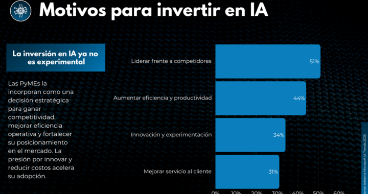 En América Latina, más del 50% de las PyMEs ya incorporó soluciones de IA y el 70% planea seguir invirtiendo, según el informe Microsoft IA Trends 2025. La transformación no es cosmética, está redefiniendo la forma en que se produce, se vende y se compite. En este escenario, Argentina adquiere una dimensión propia, pues el 60% de las pequeñas y medianas empresas locales ya utiliza algún tipo de inteligencia artificial o IA generativa y el 58% afirma hacerlo de manera frecuente.