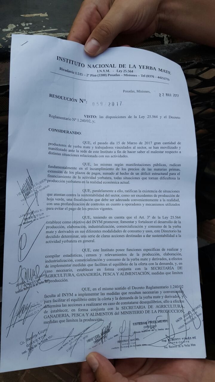 El pasado 15 de marzo los productores cumplieron su promesa. Luego de un año de reclamos, con 39 actas de reuniones en diferentes ámbitos, en la provincia y a nivel nacional, incluso luego de llevar un #yerbatazo a Buenos Aires, no fueron escuchados. Por ello decidieron protestar frente a la sede del INYM en Posadas, llegado a ingresar a la fuerza al Instituto.