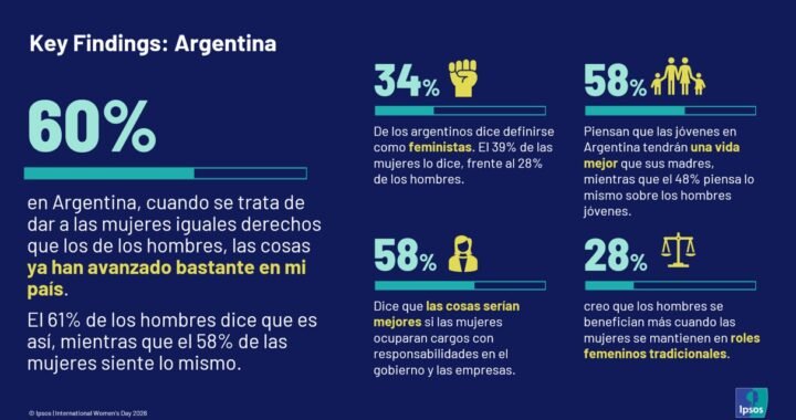 “En Argentina, el 60% de las personas considera que se ha avanzado lo suficiente en materia de igualdad de derechos entre hombres y mujeres; esta percepción es compartida por el 61% de los hombres y el 58% de las mujeres. Es decir, las opiniones no son completamente homogéneas entre géneros, incluso dentro de esta mayoría que entiende que el avance ha sido suficiente. En comparación con el promedio global del 52% en los 29 países relevados, Argentina se ubica por encima de la media global, lo que permite contextualizar cómo se posiciona el país dentro del escenario mundial”, señaló Martín Tanzariello, Gerente de Marketing y Comunicación en Ipsos Argentina.