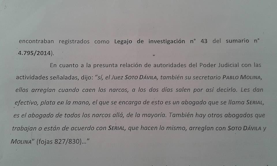 Además de las escuchas citadas por el juez Torres, el fiscal Schaefer tuvo en cuenta la declaración de un “testigo de identidad reservada que denuncia vínculos con el nacotráfico por parte del juez Soto Dávila y el secretario Pablo Molina”.