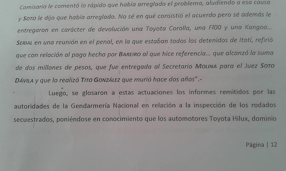 El expediente de procesamiento firmado por el juez Torres dice textualmente: “Bareiro pagó un millón y medio de pesos al juez que estaba de turno en esa oportunidad, el juez Soto Dávila, por su libertad. Eso fue para que no se haga efectiva la captura que pesaba sobre el mismo…se escuchó que un allegado del juez fue a cenar al domicilio de Bareiro para ir a buscar la plata. Que el secretario del juez, un tal Molina, se encargaba de hacer las transacciones. O sea, hacía de intermediario del juez para estas cuestiones”.