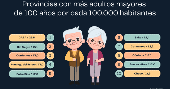 A nivel provincial, la Ciudad Autónoma de Buenos Aires encabeza la lista de jurisdicciones con mayor proporción de personas centenarias en Argentina, con 23,8 por cada 100.000 habitantes. En segundo lugar se ubica Río Negro, que registra 15,1, seguida por Corrientes con 13,0. Más abajo aparecen Santiago del Estero, también con 13,0, y Entre Ríos, que alcanza 12,8.
