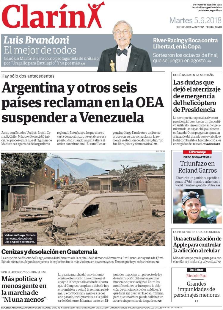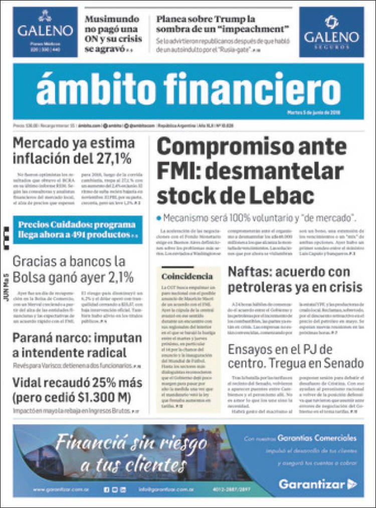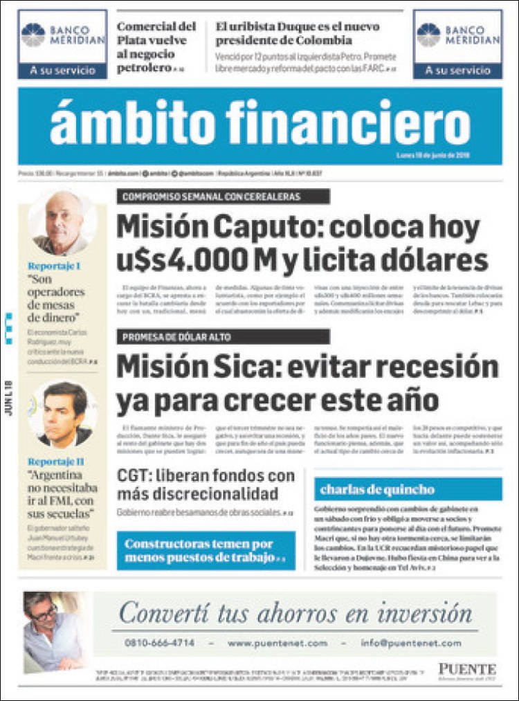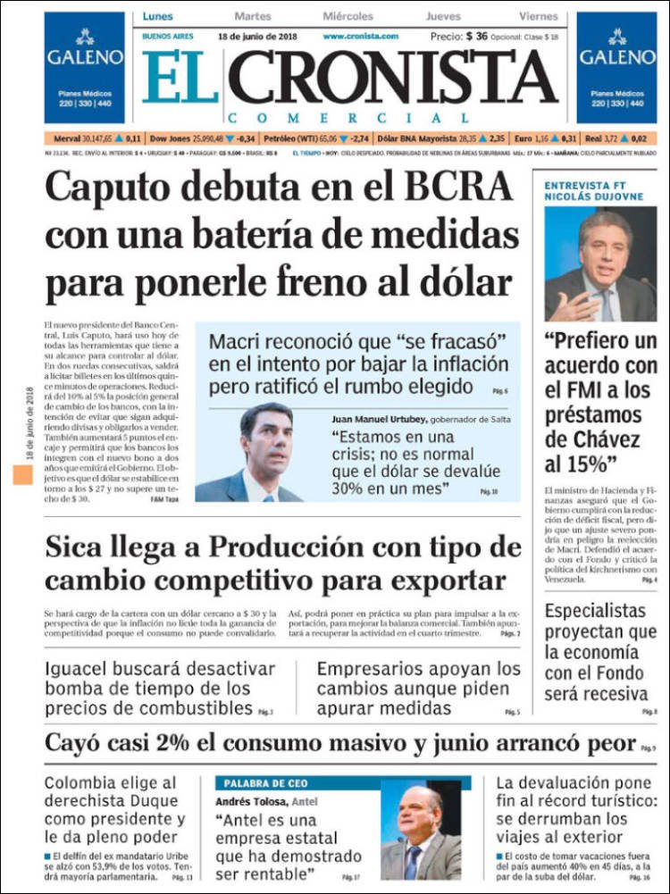 A continuación, repasamos las tapas de los diarios del lunes 18 de junio. Los titulares principales tienen que ver con la reapertura del mercado de cambios y las medidas de Luis Caputo, su nuevo titular, para frenar la nueva corrida cambiaria. Además, los cambios que piensa Sampaoli para enfrentar el miércoles a Croacia.