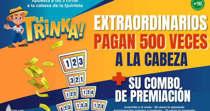 Las apuestas a las tres cifras a la cabeza de La Trinka de la Quiniela pagarán en marzo 500 veces el monto de la apuesta, igual que las apuestas simples de tres cifras a la cabeza, pero con un combo extra de otros posibles premios que la hacen una apuesta dinámica con múltiples posibilidades. Es decir que además de la coincidencia plena, también paga la coincidencia al revés, la aproximación anterior y posterior y las tres posibles combinaciones de dos cifras del número apostado.