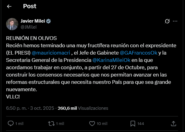 “Recién hemos terminado una muy fructífera reunión con el expresidente @mauriciomacri, el Jefe de Gabinete @GAFrancosOk y la Secretaria General de la Presidencia @KarinaMileiOk en la que acordamos trabajar en conjunto, a partir del 27 de Octubre, para construir los consensos necesarios que nos permitan avanzar en las reformas estructurales que necesita nuestro País para que sea grande nuevamente. VLLC!”, publicó Milei en su cuenta de X.