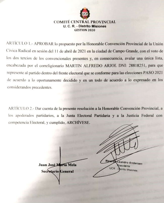 Por nueve votos de los 12 integrantes del órgano partidario ejecutivo, se decidió avalar como único precandidato a diputado nacional para las elecciones Primarias, Abiertas, Simultáneas y Obligatorias (PASO) al concejal posadeño Martín Arjol.
