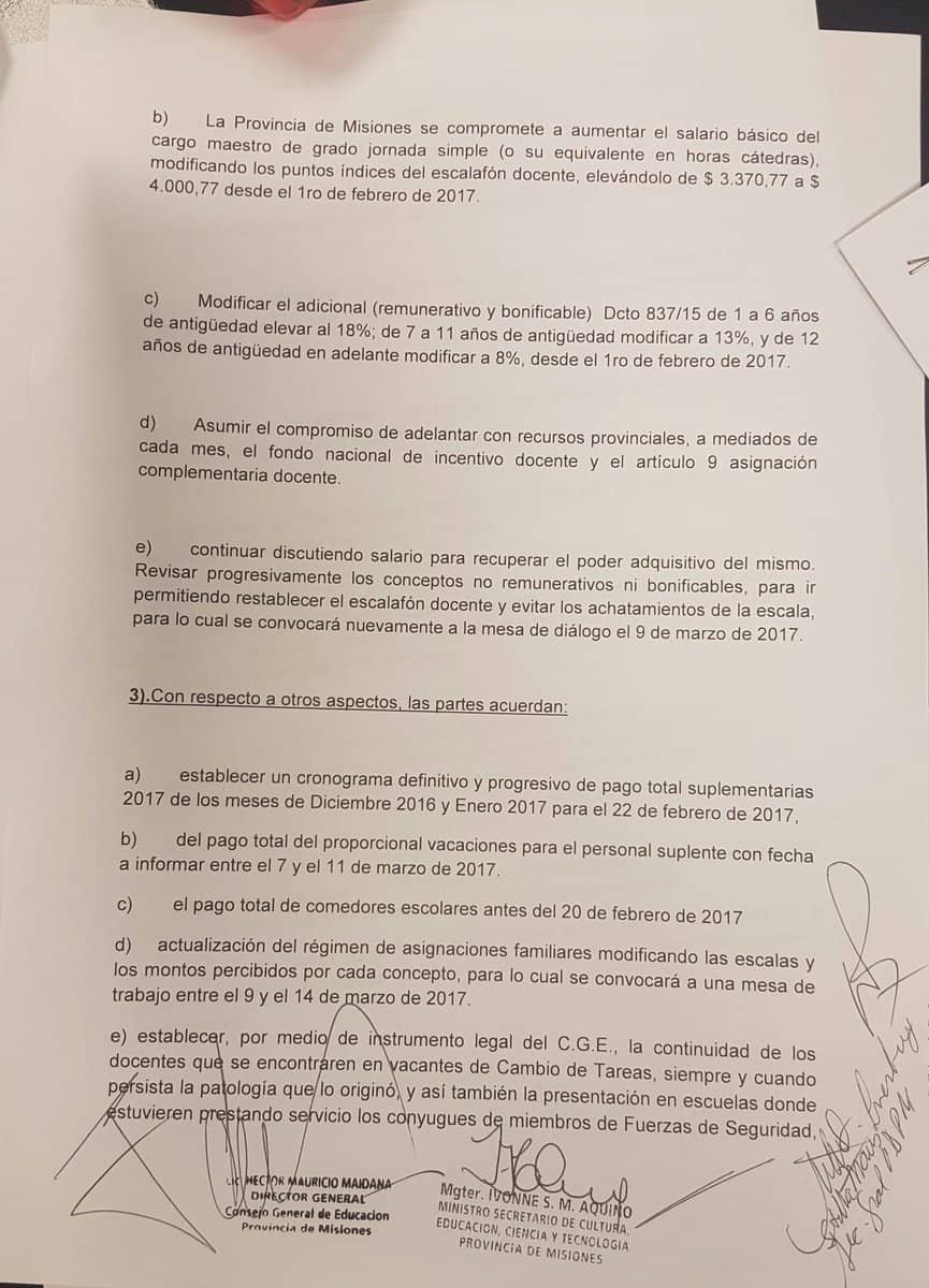 -Aumento del salario básico del cargo maestro de grado jornada simple (o su equivalente en horas cátedras), modificando los puntos índices del escalafón docente, elevándolo de $ 3.370,77 a $ 4.000,77 desde el 1ro de febrero de 2017.
