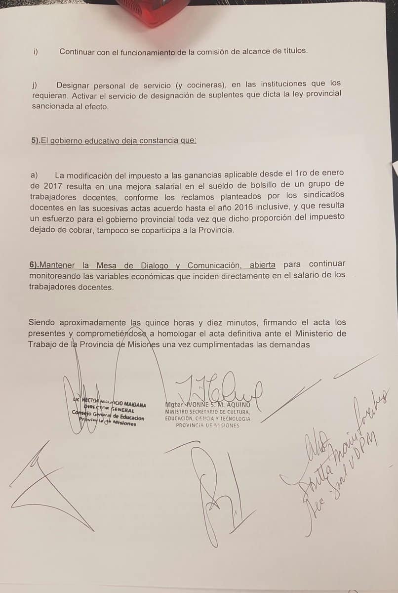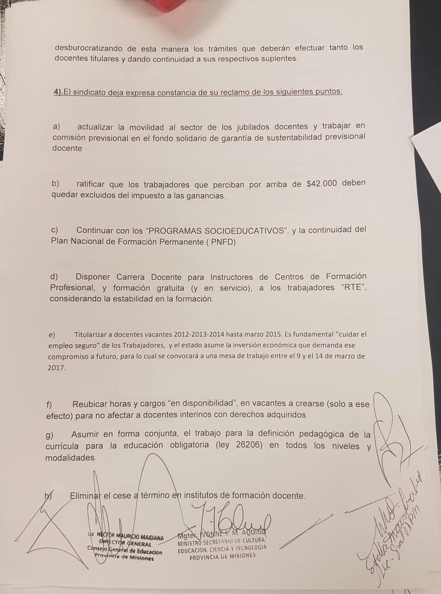 Por los gremios estuvo la representación de la Unión de Docentes de la Provincia de Misiones (UDPM), la Unión de Docentes Argentinos (UDA), el Sindicato Argentino de Docentes Privados (SADOP), la Asociación de Magisterio de Enseñanza Técnica (AMET) y el Sindicato de Docentes de Educación Pública de Gestión Privada (SIDEPP).