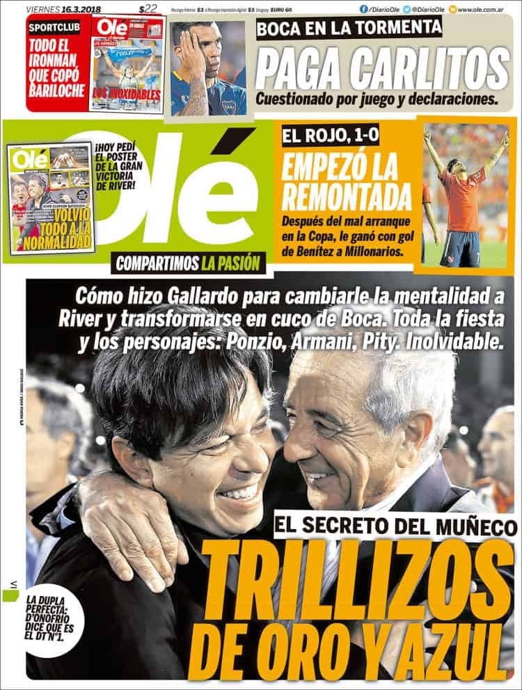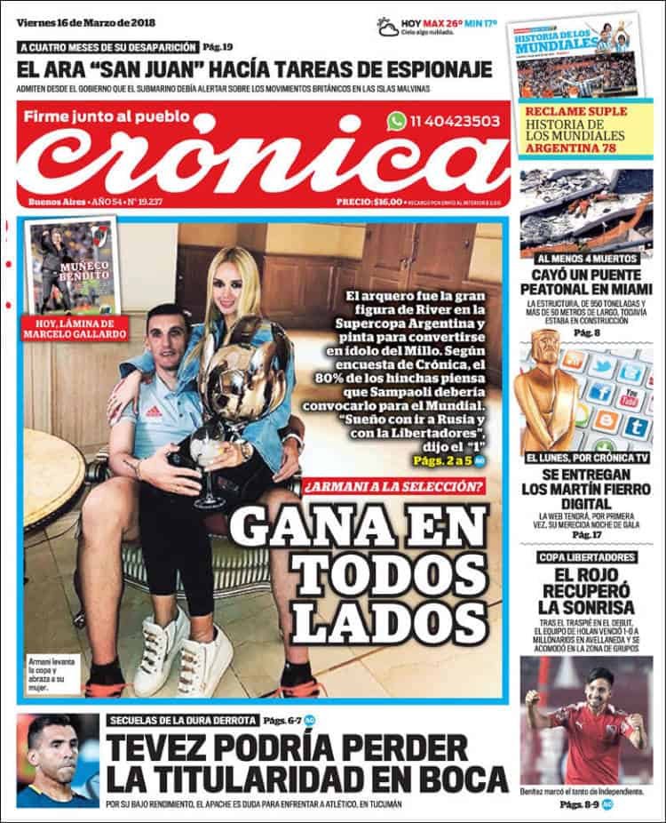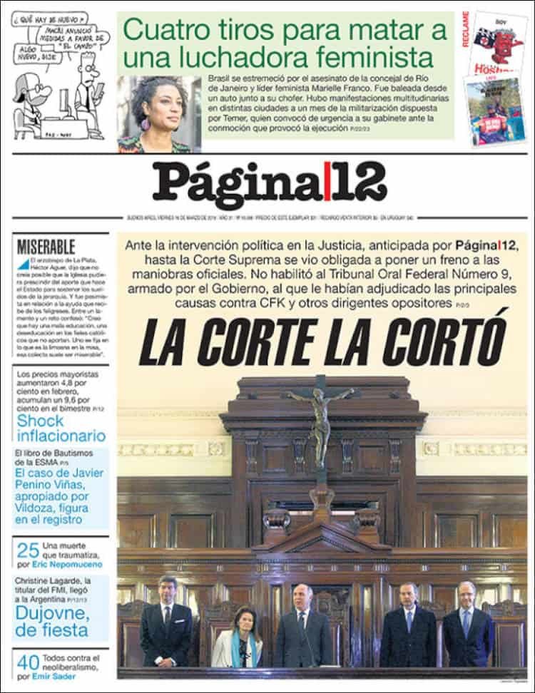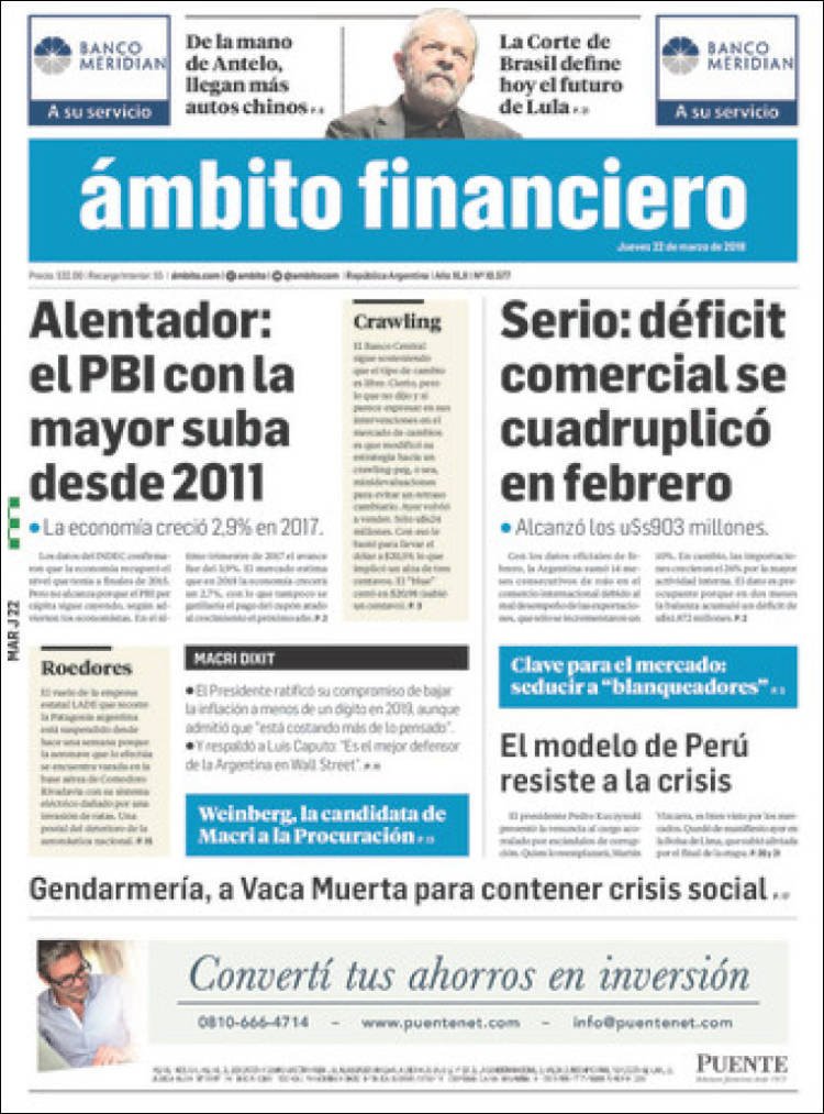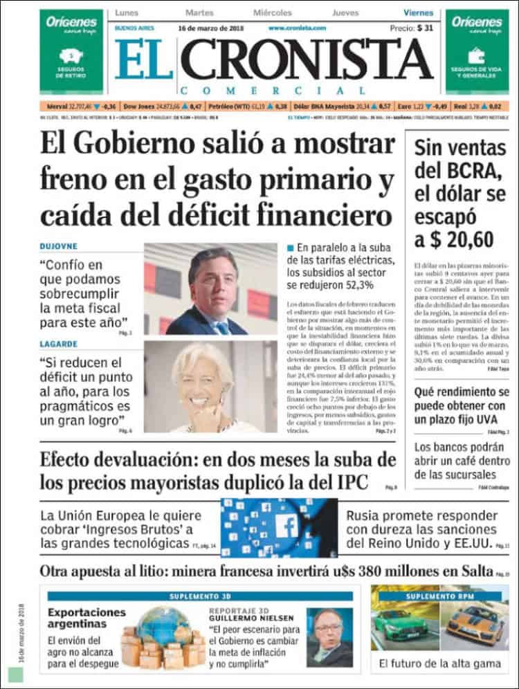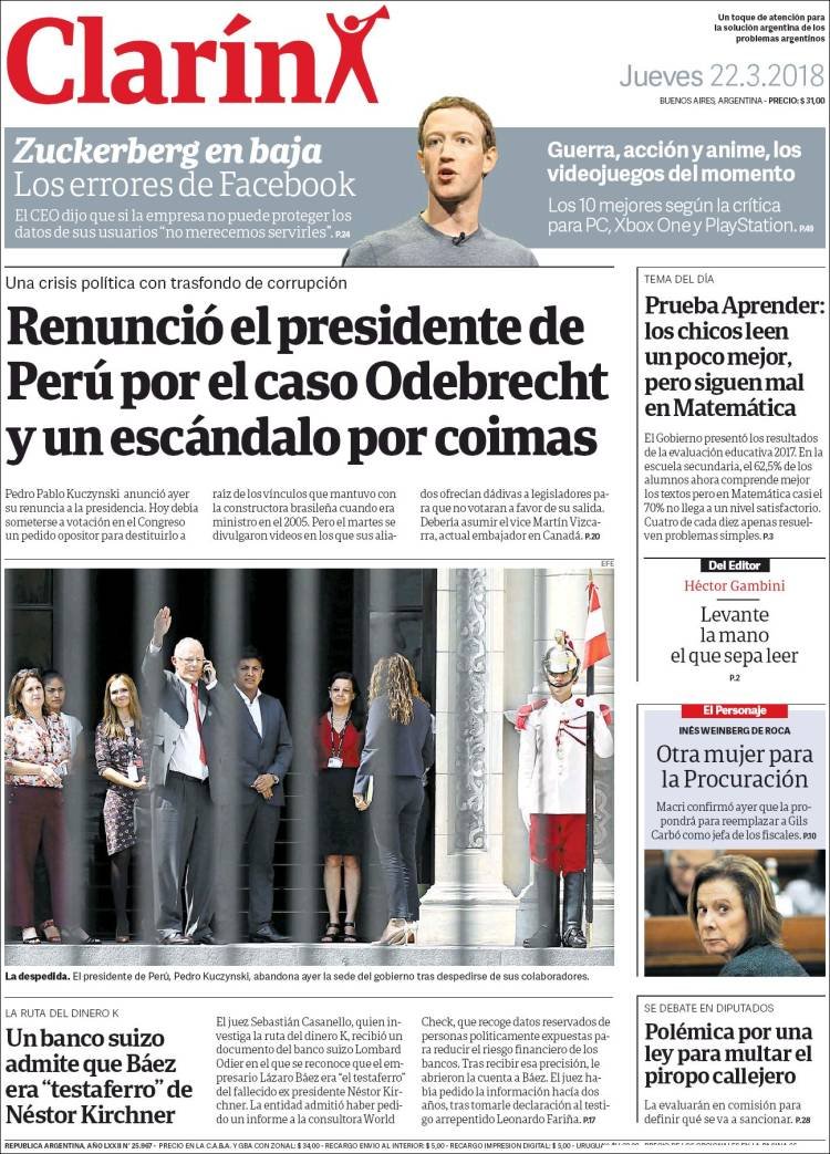 A continuación, reproducimos las tapas de los principales diarios del país. En lo político siguen las repercusiones del escándalo Facebook, también la renuncia del presidente de Perú por corrupción, los resultados del Aprender y el escándalo en Independiente. En lo económico el déficit comercial y la fiebre por el dolar