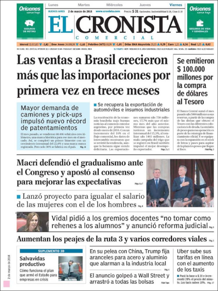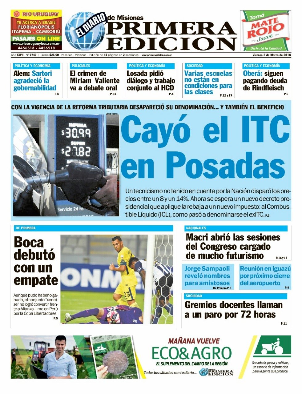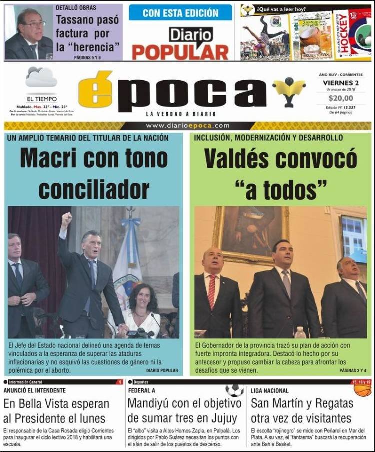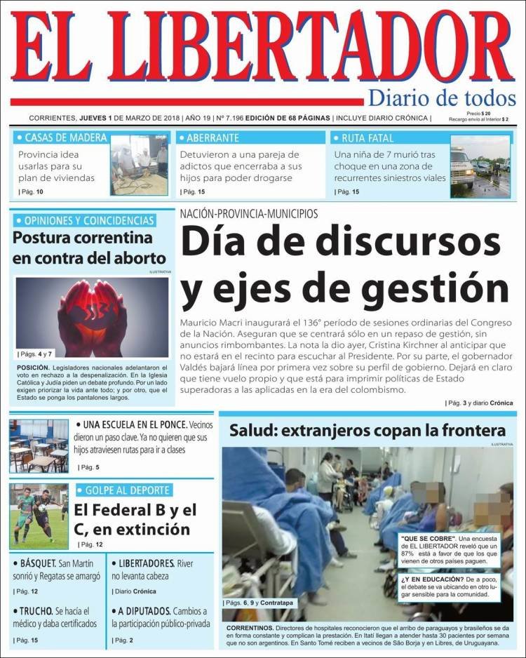 A continuación, reproducimos las tapas de los principales diarios de del país. Los temas predominantes son la apertura de sesiones a cargo de Mauricio Macri, la balanza comercial con Brasil, el precio de los combustibles en Misiones con la reforma impositiva.