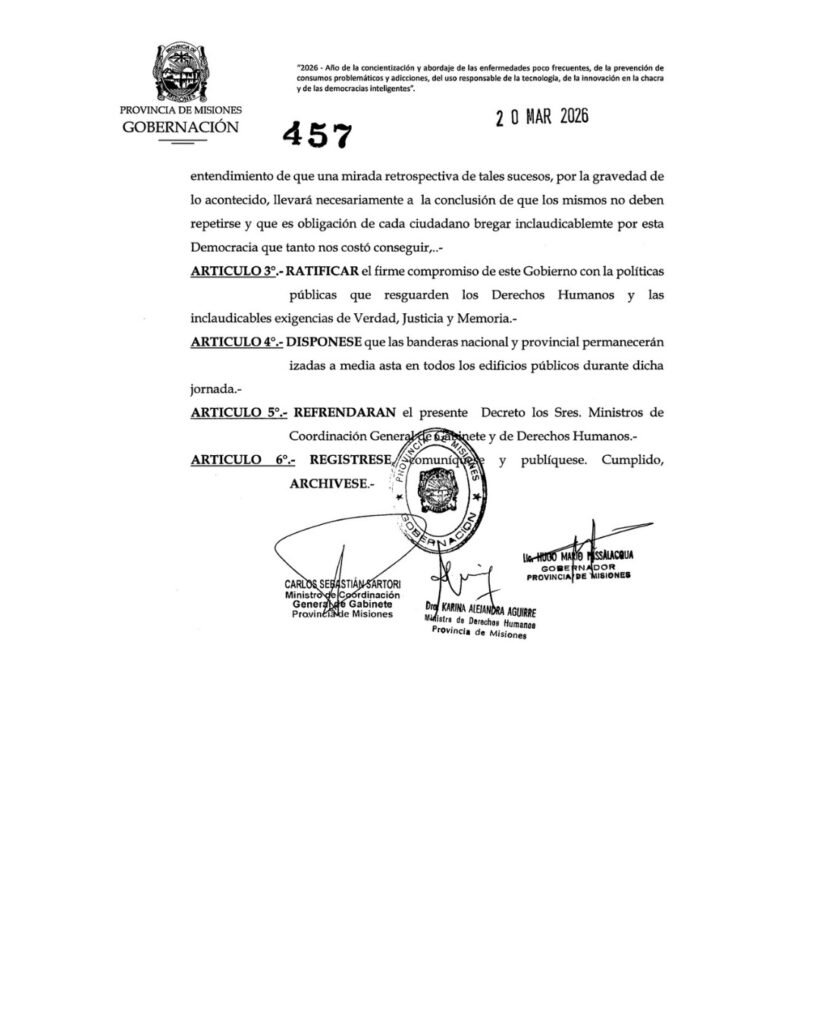 En su parte resolutiva, el Decreto 457 dispone tres movimientos centrales. Primero, declara el 24 de marzo de 2026 como jornada de reflexión y memoria en toda la provincia de Misiones, en conmemoración del 50° aniversario del “trágico golpe cívico militar” de 1976. Segundo, invita a los habitantes de la provincia a reflexionar con sentido crítico sobre los acontecimientos sucedidos en el país a partir de esa fecha y, de manera especial, sobre la “cruel metodología” empleada por el gobierno de facto de entonces. Tercero, ratifica el firme compromiso del Gobierno con las políticas públicas que resguarden los derechos humanos y las exigencias de Verdad, Justicia y Memoria.