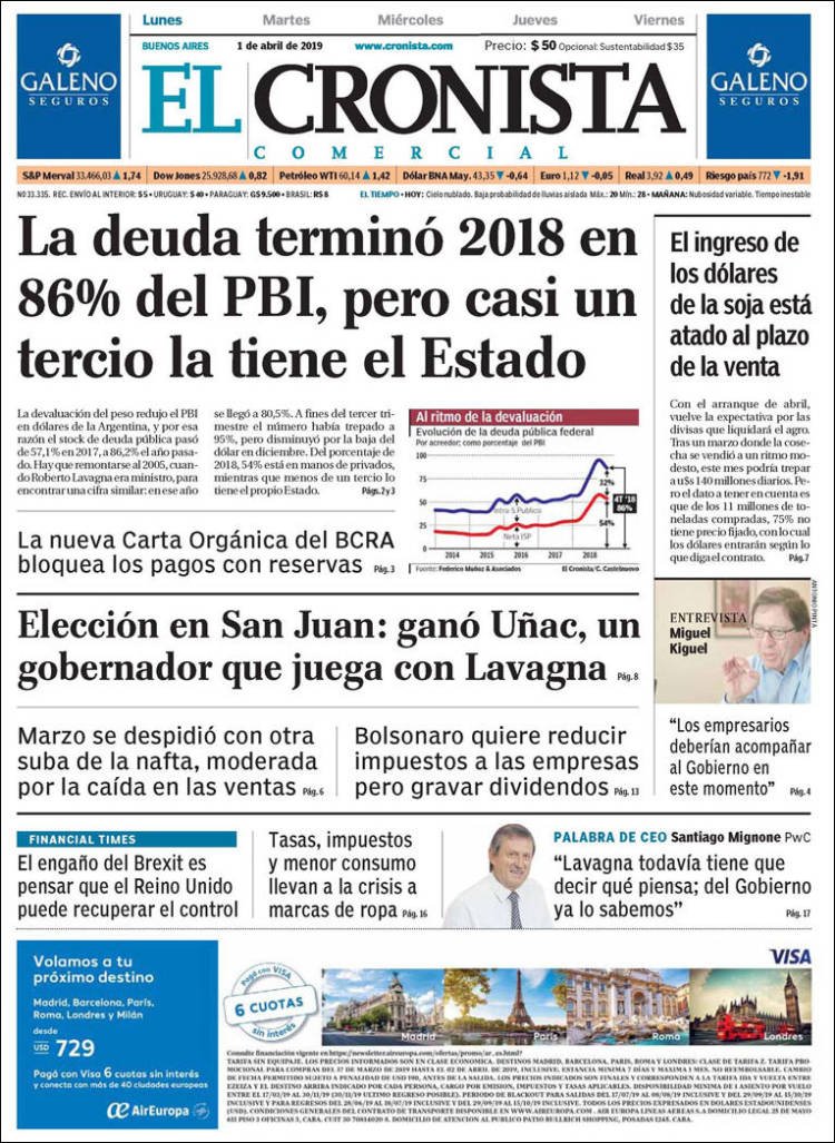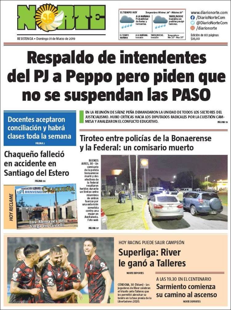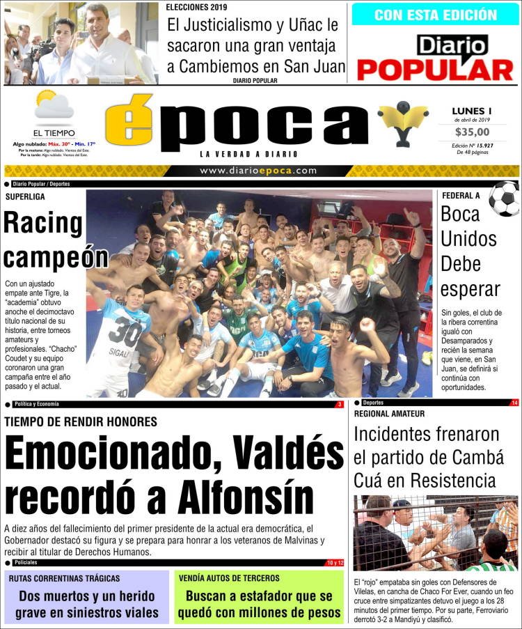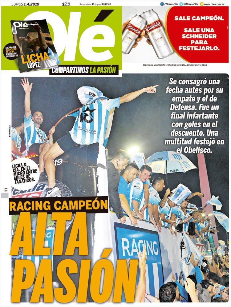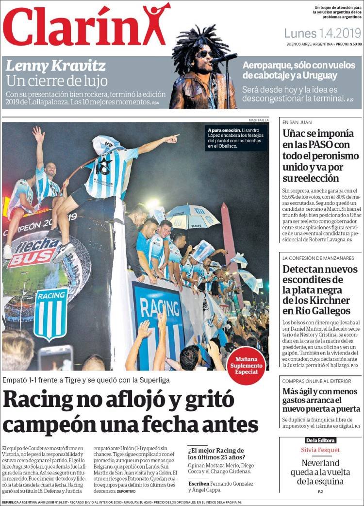 A continuación, repasamos las tapas de los diarios del lunes 1° de abril. El festejo de Racing, que se consagró campeón de la Superliga, es el título y la foto excluyente de todas las portadas. También es un tema importante el triundo de Sergio Uñac en las PASO de San Juan, que le abre la puerta para una eventual fórmula como vice de Lavagna.