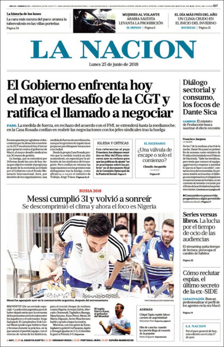A continuación, repasamos las tapas de los diarios del lunes 25 de junio, donde la expectativa por el acatamiento al paro nacional es el tema dominante. Todos los diarios anticipan una alta adhesión debido a que no habrá colectivas (UTA). Además, las novedades de la Selección que prepara el choque ante Nigeria del martes. Habló Mascherano y Tapia.