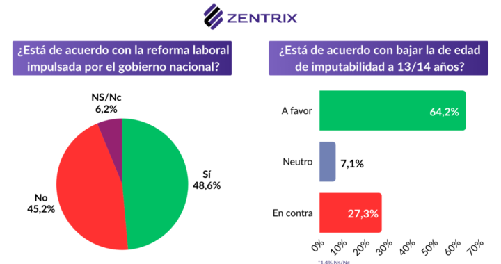 La nueva medición del Monitor de Opinión Pública exhibe una clara sintonía entre los temas en debate legislativo y la opinión pública. El 64,2% se muestra a favor de bajar la edad de imputabilidad a 13/14 años, mientras que el 48,6% respalda la reforma laboral actualmente en discusión. En ese contexto, el Gobierno nacional logra apropiarse de la agenda pública y convertirla en capital político, algo que se refleja en la imagen positiva de Javier Milei, que alcanza el 47%, en un escenario de fuerte polarización.