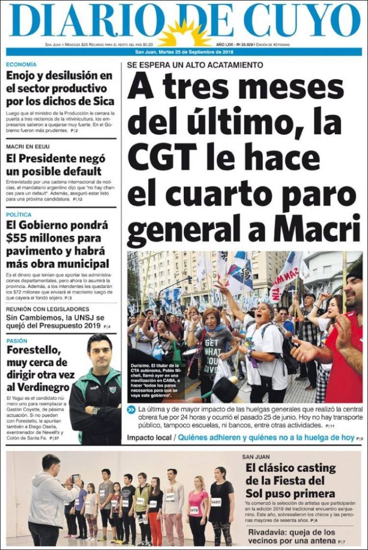 - “También, tomando el indicador de “Frecuencia de paro medido en días”, el Presidente De la Rúa es quien se llevó la peor parte con un paro cada 92 días; seguido de Alfonsín, con un paro cada 157; cerrando la lista Macri con un paro cada 255 días. Curiosamente, Macri es el Presidente no peronista mejor ubicado según ese indicador, e iguala a Duhalde, el peronista peor rankeado quien sufriera también un paro general cada 255 días”.