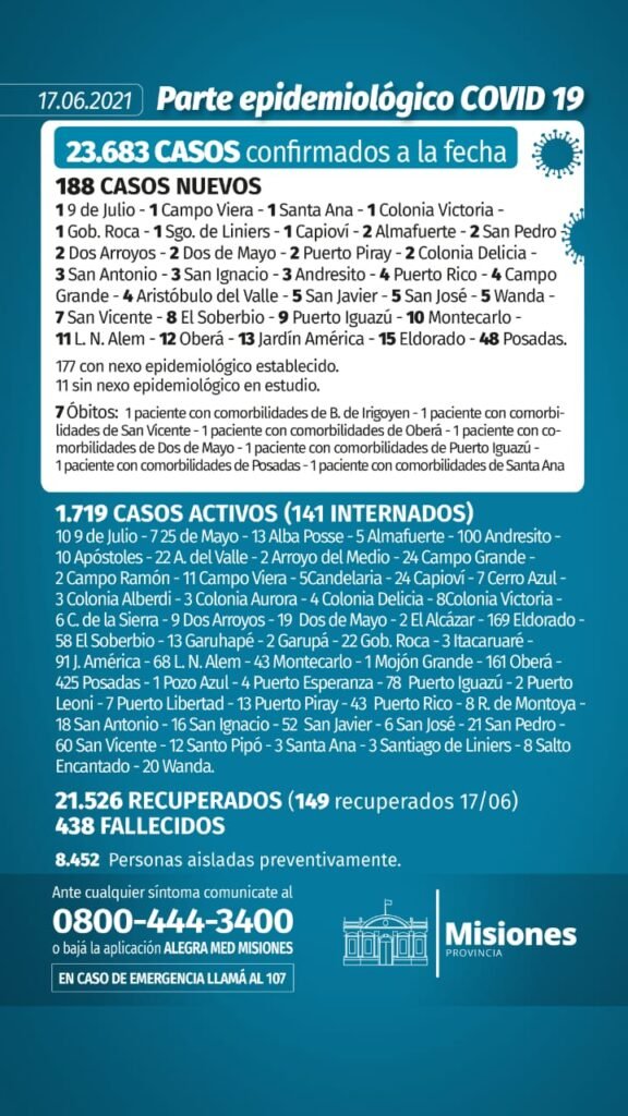 El parte oficial del Ministerio de Salud del jueves (17/06) reveló 188 nuevos casos de coronavirus y el fallecimiento de siete personas con Covid-19. De esta forma Misiones acumula 23.683 contagios y 438 muertos desde el inicio de la pandemia.
