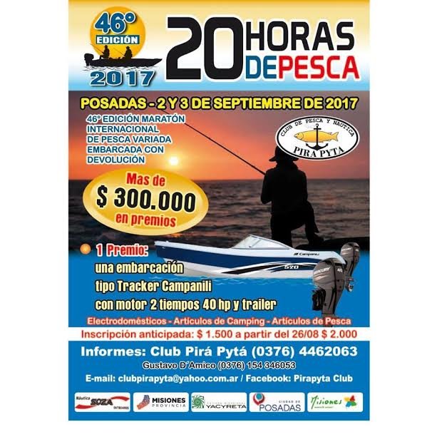 La Maratón Internacional de Pesca Variada embarcada con devolución “20 horas” se desarrollará el 2 y 3 de septiembre próximos. La cancha será sobre el río Paraná en el tramo entre el puente internacional San Roque González de Santa Cruz hasta la desembocadura del arroyo Martíres frente a la ciudad de Posadas.