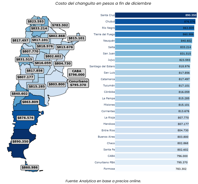 El relevamiento de Analytica también expone con claridad la brecha regional en el costo del changuito. Santa Cruz lidera el ranking con la canasta más cara del país, con un valor de $890.350, seguida por Chubut ($876.576), Río Negro ($863.809), Tierra del Fuego ($860.986) y Neuquén ($840.602). Todas estas provincias pertenecen a la región patagónica.