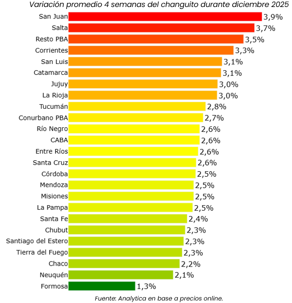 En diciembre, el costo del changuito registró los mayores incrementos mensuales en San Juan (+3,9%), Salta (+3,7%) y el interior de la provincia de Buenos Aires (+3,5%). En el extremo opuesto, Formosa mostró una suba significativamente menor, de apenas +1,3%, muy por debajo del promedio del resto del país.